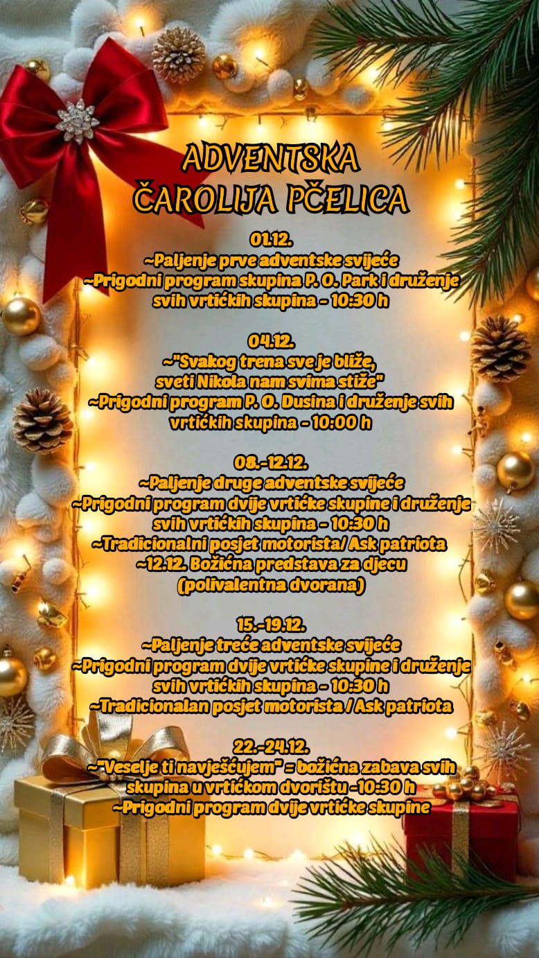 ✨ ADVENTSKA ČAROLIJA PČELICA ????Dragi roditelji i prijatelji našeg vrtića, pozivamo vas na prvi adventski program našeg vrtića. Pridružite nam se u čarobnom prosincu ispunjenom pjesmom, druženjem, kreativnošću i blagdanskim duhom! ????Kroz cijeli mjesec očekuju nas raznolike aktivnosti – paljenje
