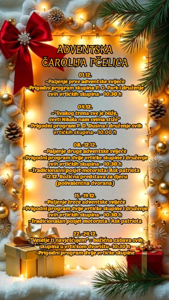 Dragi roditelji i prijatelji našeg vrtića, pozivamo vas na prvi adventski program našeg vrtića. Pridružite nam se u čarobnom prosincu ispunjenom pjesmom, druženjem, kreativnošću i blagdanskim duhom! ????